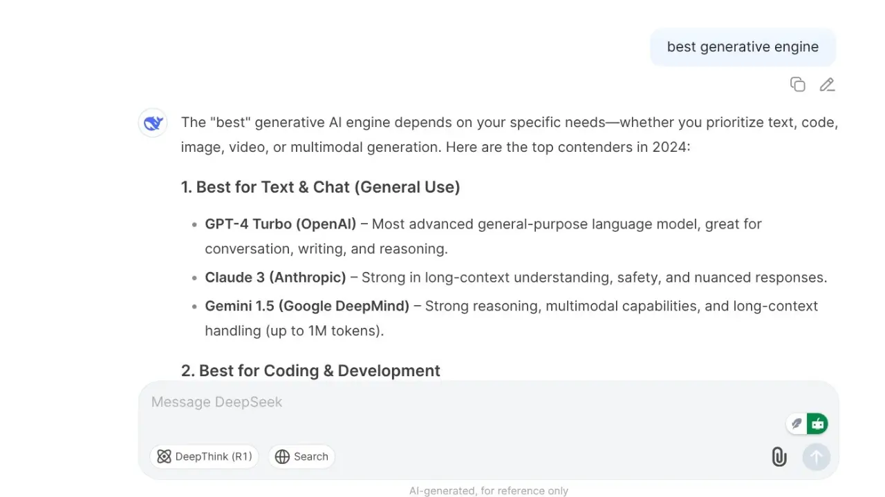 DeepSeek in Action: A search for “best generative engine” produces a structured, AI-generated overview that categorizes top models by use case, such as GPT-4 Turbo, Claude 3, and Gemini 1.5 for text and chat, along with dedicated sections for coding, images, and more.12 This shows how DeepSeek combines direct, context-aware answers with categorized recommendations, making it both a generative engine and a tool discovery platform.